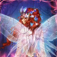 a fantasy character who appears to be a fairy with red hair. She is wearing a sparkly outfit that suggests a magical or ethereal theme, and there are elements in the background such as