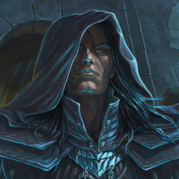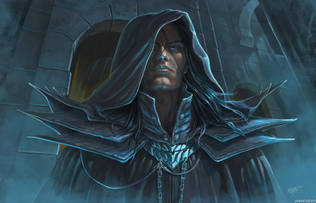 This image depicts a character with an ominous and mysterious appearance. The individual has a hood drawn over their head, giving them