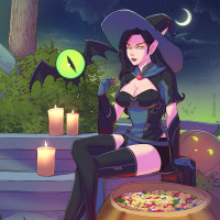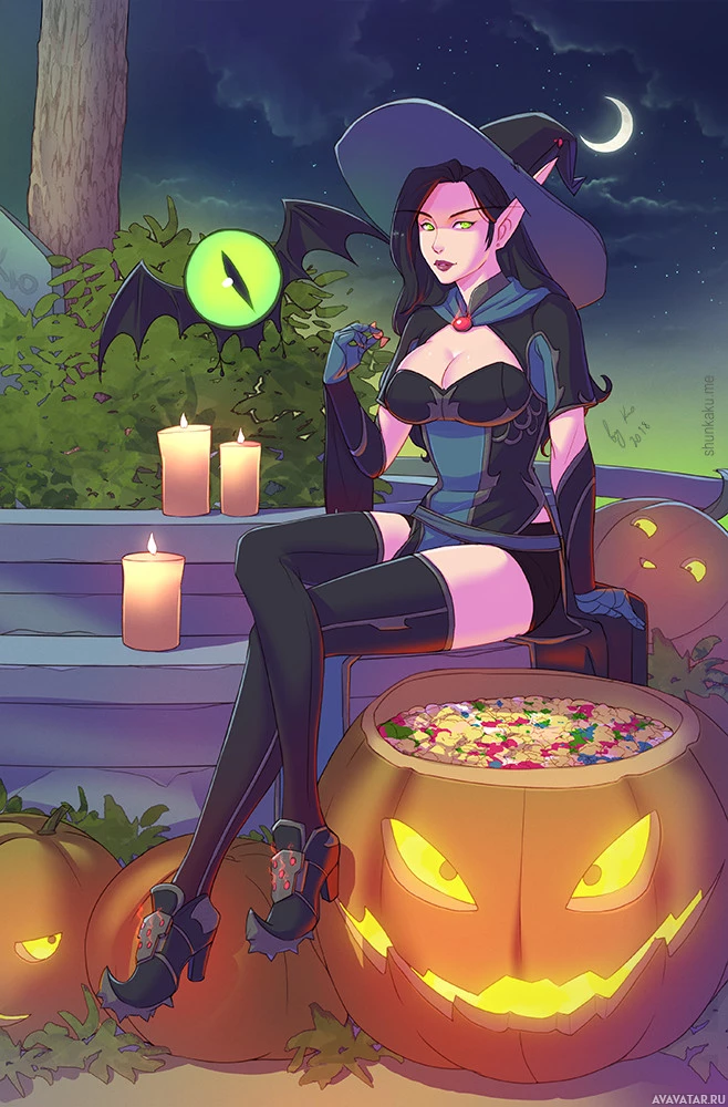 black boots that have straps around the calves. The character is holding a broom in her right hand. In front of her are two jack-o'-lanterns carved from pumpkins, adding to the Halloween theme. Behind her, there's a lit candle and another jack-o'-lantern, which is on a table and has a distinctive green cat's eye in place of the usual