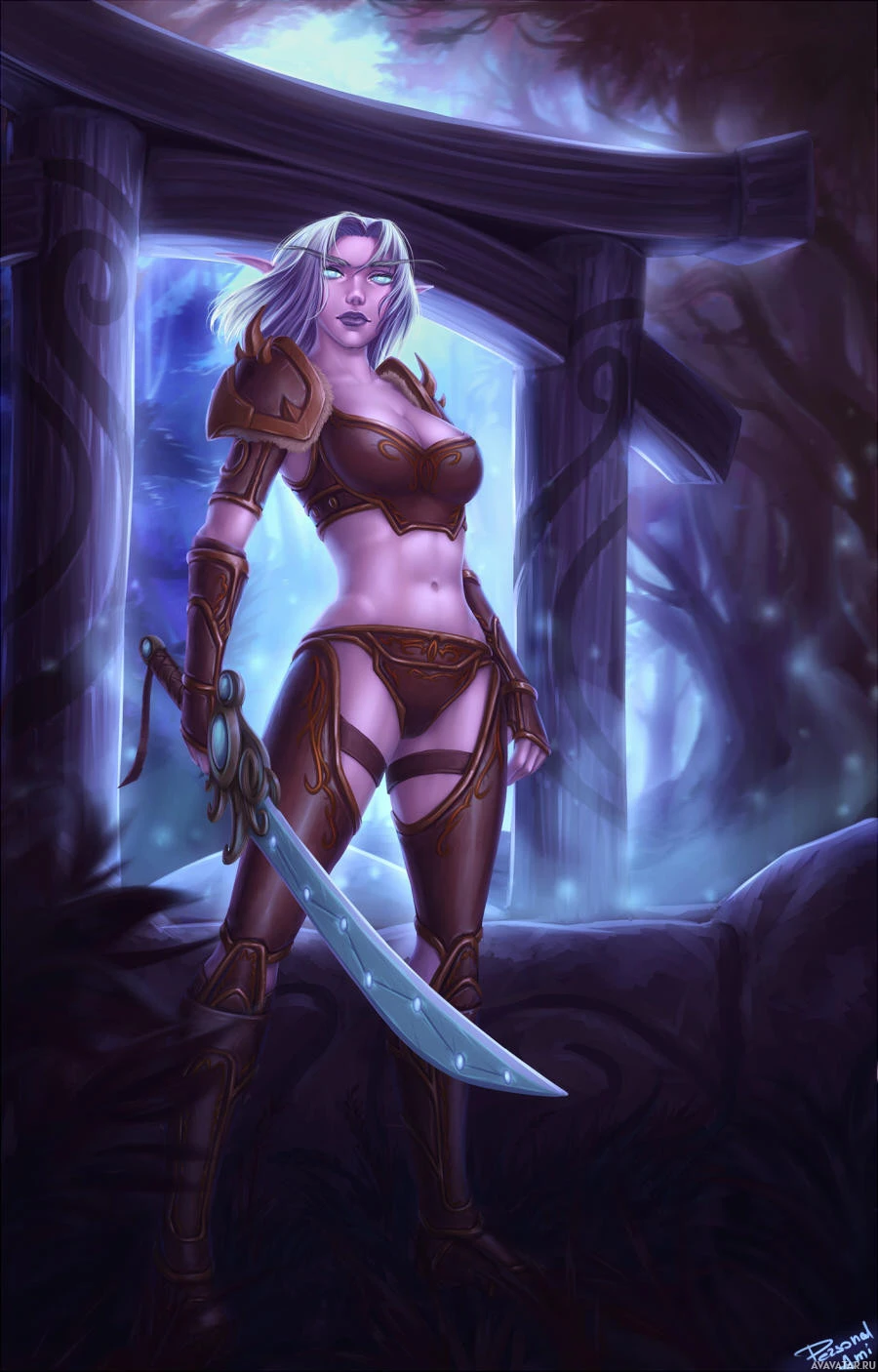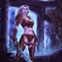 a fantasy character who appears to be a drow, which is a term often used in fantasy media for dark-skinned elves. She is depicted wearing armor and holding a sword, suggesting she could be a warrior or adventurer. The setting looks like it could be from