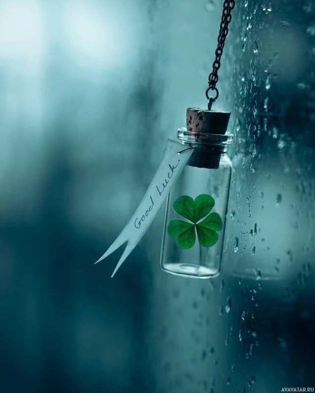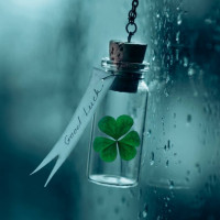recent rain. There's also a label tied to the bottle that reads "Good Luck," and inside the bottle appears to be