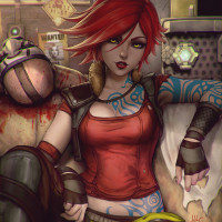 The image depicts an animated character with red hair, sitting on a chair. She is wearing a red jacket and has tattoos visible on her arms. There is some blood or a liquid on the ground in front of her feet. The style of the artwork suggests it could be from a video game or animated series.