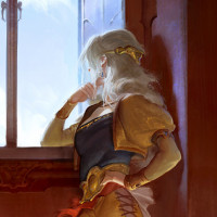 a yellow dress and has her hand on her chin in a thoughtful pose. To her left, there's a small