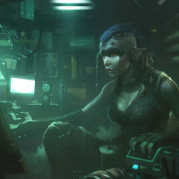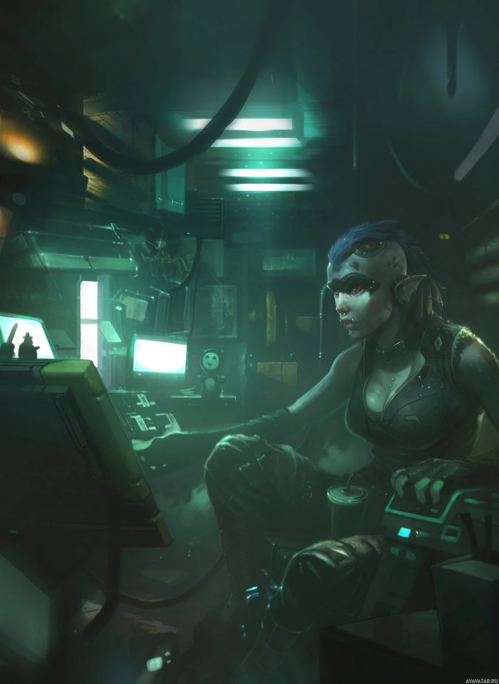 the control room of a spacecraft or underwater facility. The individual has a cybernetic arm and face, which is indicative of a mutant in the context of