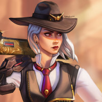 На картинке изображен персонаж из видеоигры «Overwatch». Это Эш, которая известна своей ковбойской шляпой и пушками. Она стоит в пустынной обстановке, что является одним из ее способностей героя в игре.