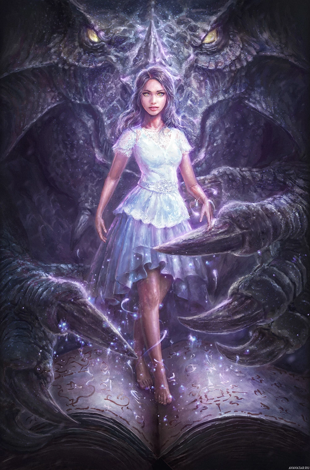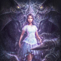 a young girl in a dress standing on what appears to be the pages of an open book. She is surrounded by fantastical elements, such as a large monster or dragon-like creature on either side of her, with its mouth agape and eyes focused intently on her. The setting seems to be a dark,