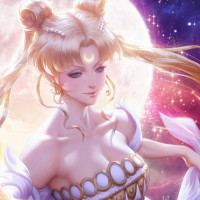 an animated character that resembles Serenity, also known as Usagi Tsukino, from the "Sailor Moon" franchise. The character is shown in a fantasy-like setting with a celestial background, holding