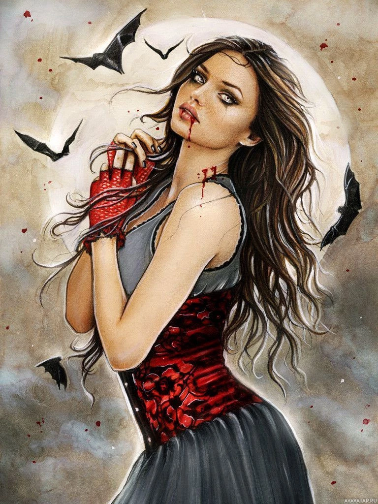 a fantasy setting, possibly portraying a vampire or similar character due to the thematic elements such as a gothic dress and the presence of bats around her head. The image is stylized with a gothic or