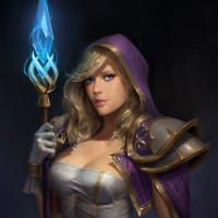 video game, specifically reminiscent of Jaina Proudmoore's attire. In her hand, she holds a staff with a glowing gem at its top, which suggests she might have magical or combat abilities in her