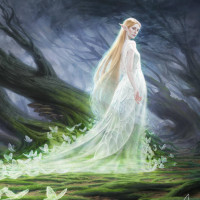 a fantasy scene featuring an elf. The elf is dressed in what appears to be a long, flowing dress with intricate detailing. They have long
