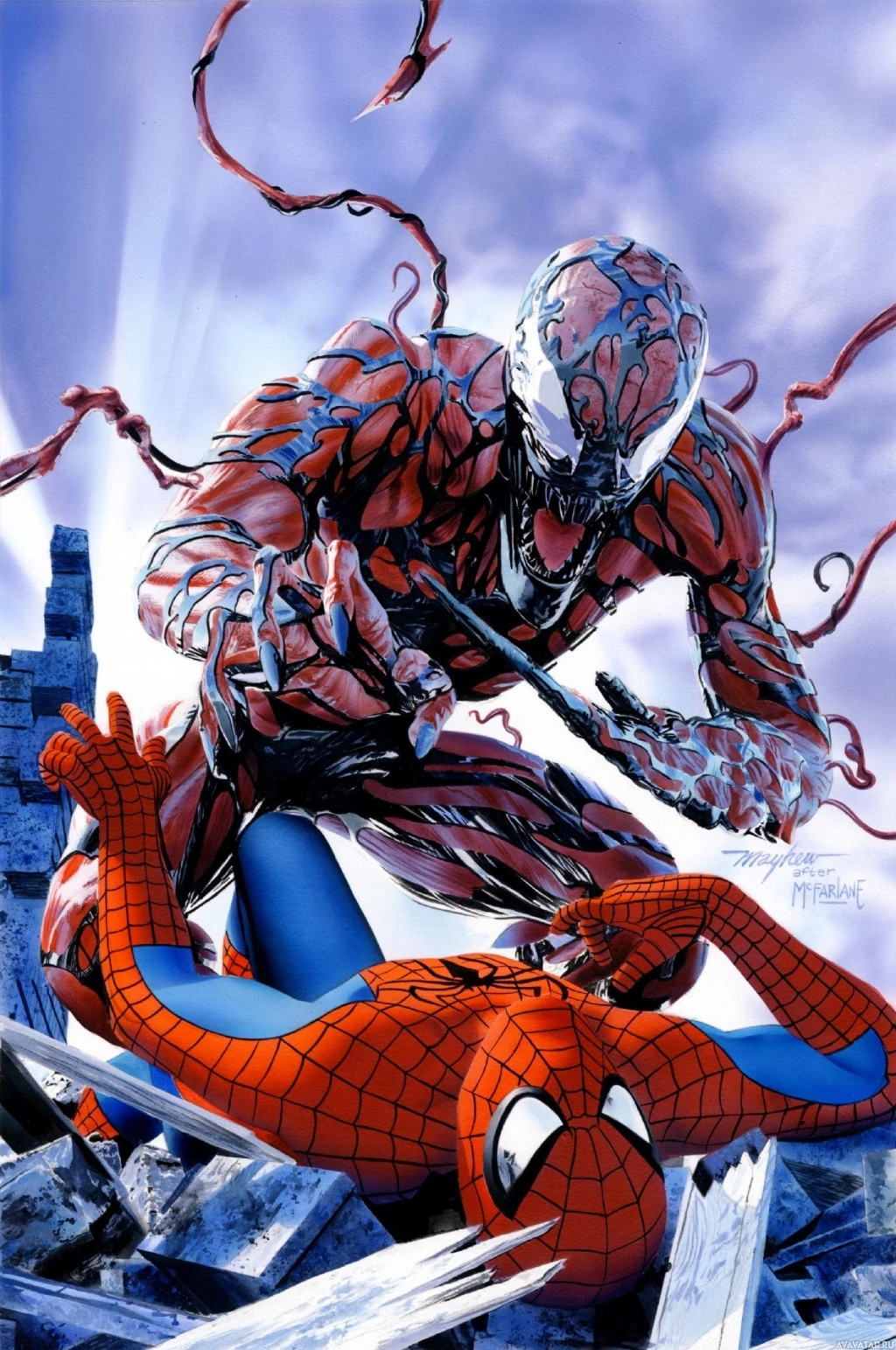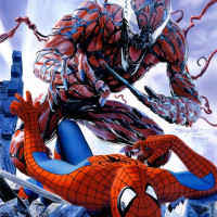 a web design on his chest. On the right, there is Carnage, a villainous character known for his