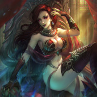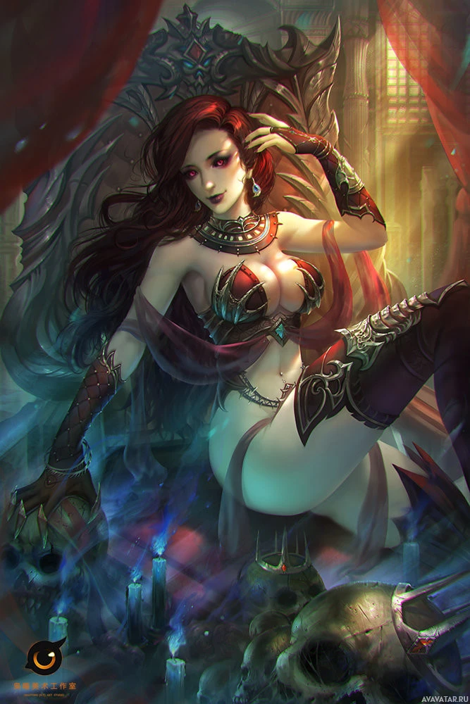 high boots, and what looks like a cape or shawl draped over her shoulder. The background suggests a mystical or dark setting with a throne, candles, and other elements that contribute to