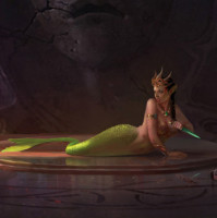 a fantasy scene with a mermaid. The setting appears to be a dungeon or underground chamber, characterized by stone walls and a large sculpture of a face in the background, which may represent a guardian or entity from