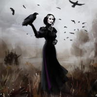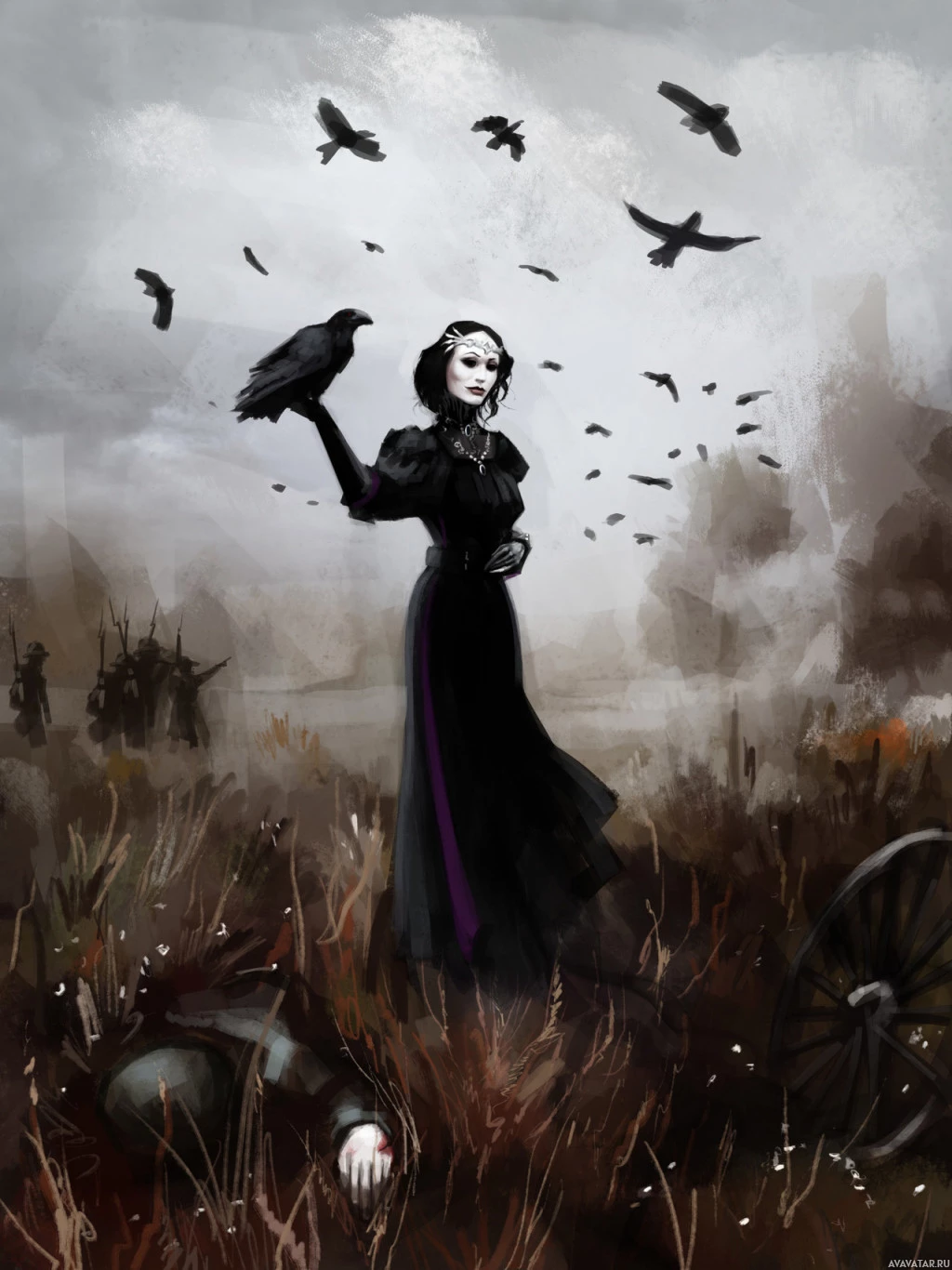 dark clouds. The woman is holding what looks like a crow on her hand, which could symbolize