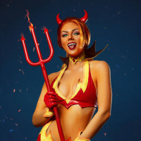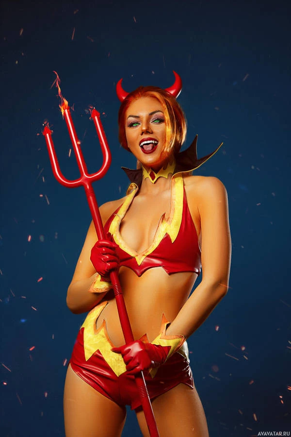 demon character. She is wearing a red and gold suit with horns on her head, and she has a devilish appearance with exaggerated features such as