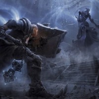 the video game "Diablo III." One character is equipped with a hammer and shield, standing in front of another character who is holding out their hands in a defensive or pleading stance. Both characters are wearing armor and have distinctive features that suggest they might be part of different factions within