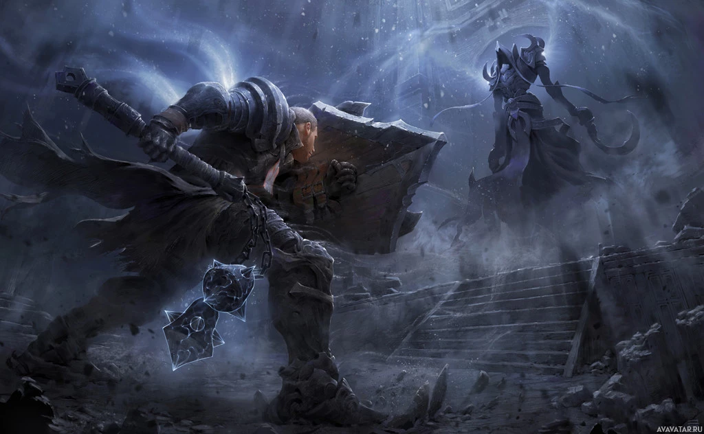 the Diablo universe. The setting appears to be a dramatic and possibly post-apocalyptic environment, with ruins and a dark,