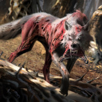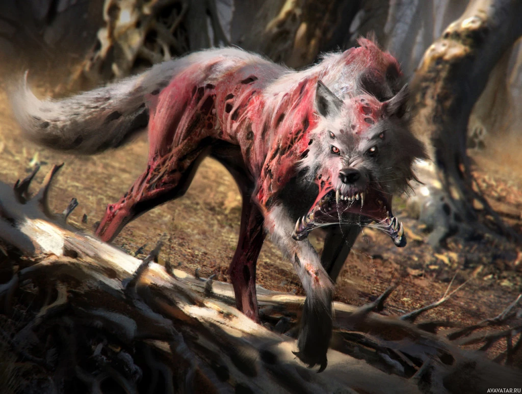 The image shows a wolf that appears to be infected or mutated with a reddish-
