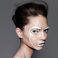 The image shows a woman with a symmetrical face painting or makeup, giving her an almost mirrored appearance on both sides of her face. She has