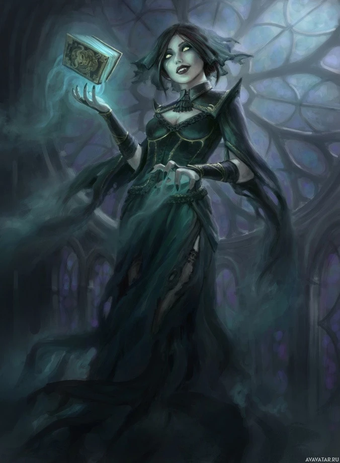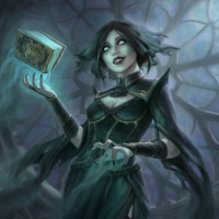 an open book, which could suggest that she is reading or casting a spell from it. Her attire consists of dark robes, and her overall appearance conveys