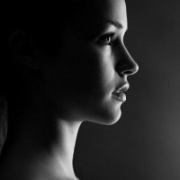 The image shows a side profile of a woman. She appears to be looking downward, possibly at something on the ground or another surface. Her facial expression is neutral with her lips slightly parted as if she might be speaking or simply deep in thought. The lighting in the photograph creates a contrast between the illuminated side of her face and the shadow on the other side, highlighting her features and creating depth in the image.