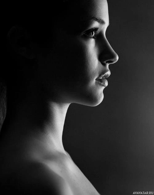 Картинка показывает боковой профиль женщины. Она, кажется, смотрит вниз, возможно, на что-то на земле или другой поверхности. Ее выражение лица нейтрально, ее губы слегка расставлены, как будто она говорит или просто глубоко в раздумьях. Освещение на фотографии создает контраст между освещенной стороной ее лица и тенью с другой стороны, подчеркивая ее особенности и создавая глубину в изображении.