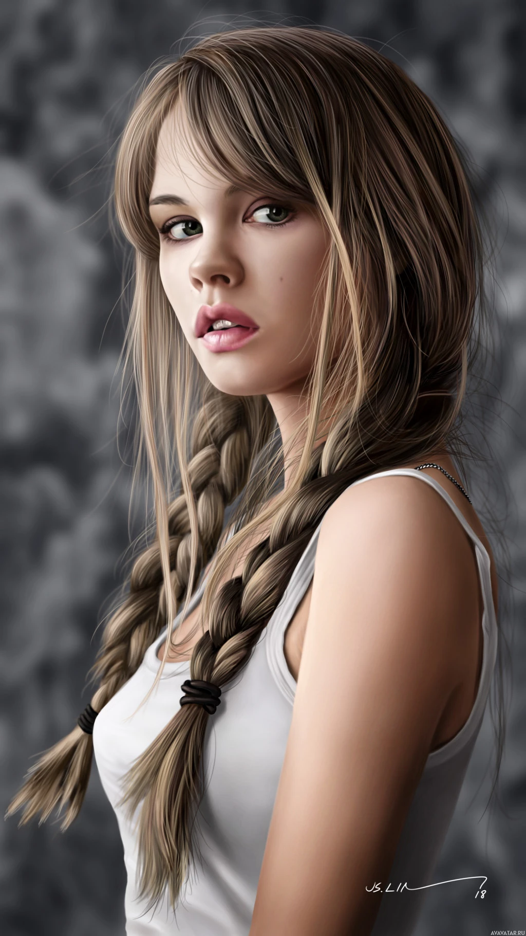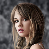 blonde hair braided and styled in a half-updo, with one strand cascading down her shoulder. Her makeup includes defined eyebrows and full,