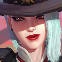 На картинке изображен персонаж из игры «Overwatch». Этот персонаж известен как Эш. Она изображена с седыми волосами и поразительной красной помадой, в стильной коричневой кожаной куртке и соответствующей шляпе, которые являются частью ее игрового наряда. Художественный стиль предполагает, что это либо произведение, созданное фанатами, либо официальная иллюстрация от художников игры.