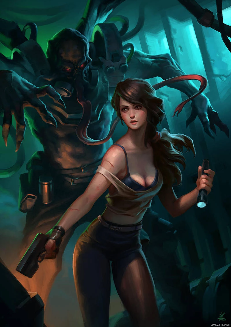 an action pose, ready for combat or exploration, with her posture suggesting readiness. Behind her stands a menacing monster that is likely an enemy or boss in the context of