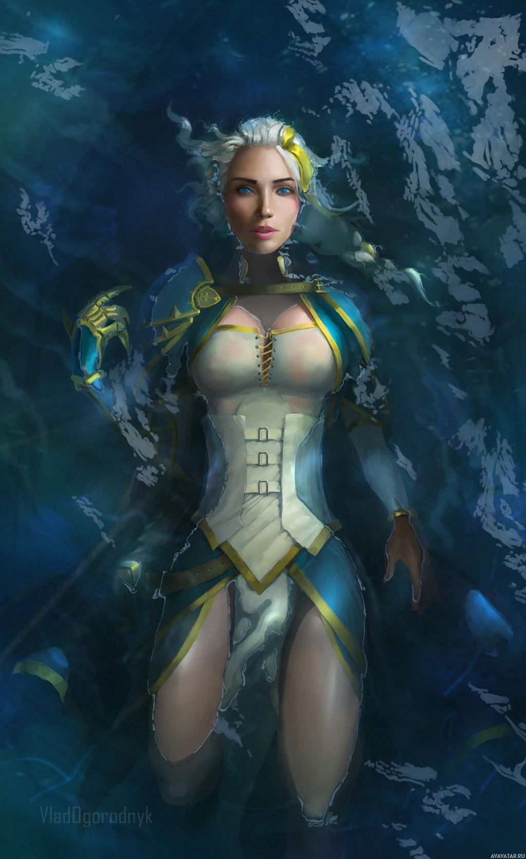 puff sleeves and has a sword or staff attached to her back. She is standing submerged in water up to about waist level, suggesting she may be in