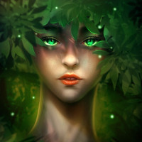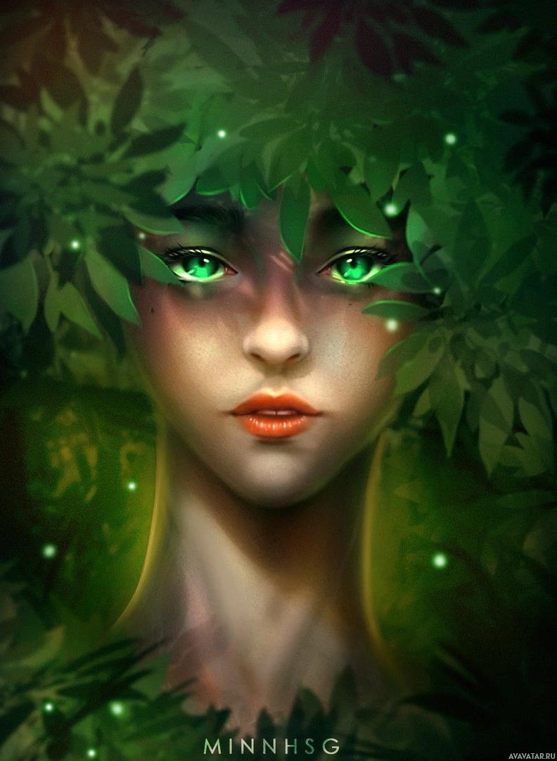 green eyes, surrounded by lush foliage. Her hair appears to be made of plants or leaves, blending her identity with nature itself. She is looking directly ahead, and there are small glowing elements resembling stars or possibly insects floating around her head. The artwork has a magical or fantasy theme, emphasizing the connection between the girl and