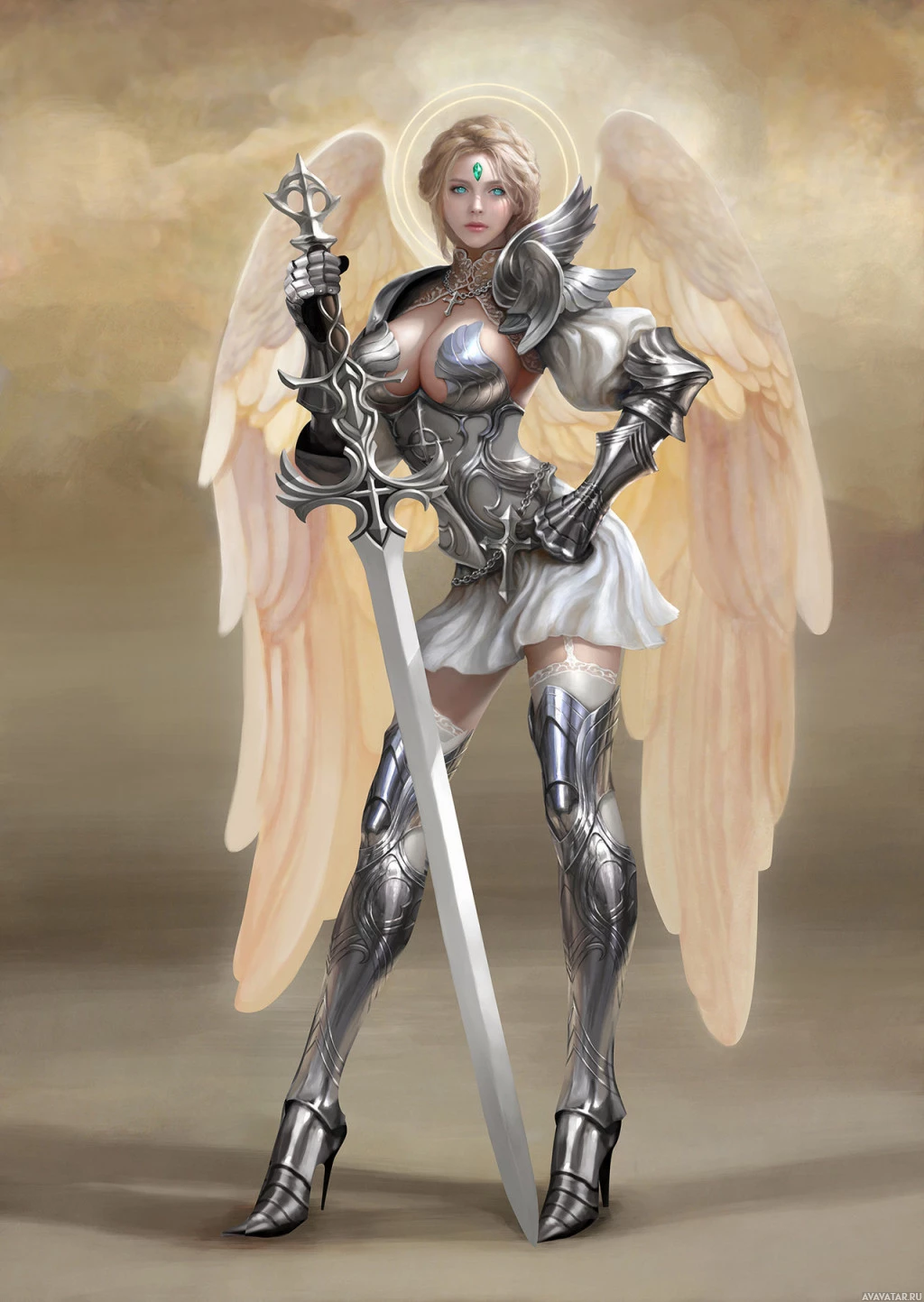 The image depicts a fantasy-themed character designed to look like an angel. This character is wearing silver armor with wings and holds a sword in one hand, suggesting a warrior or guardian archetype. The character's attire and the overall art style evoke a sense of fantasy and otherworldliness.