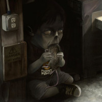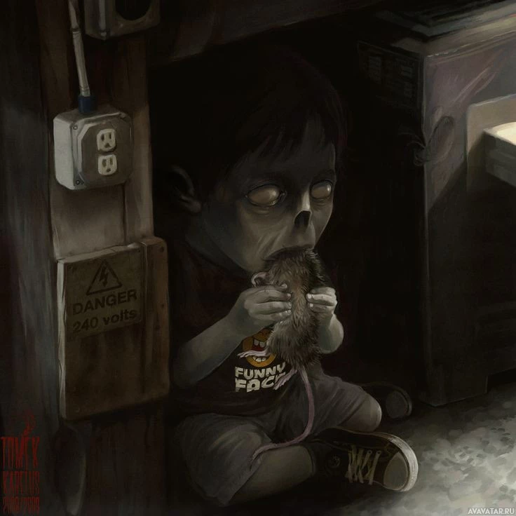 an interior space that looks like a basement or crawlspace, with signs of dampness and disrepair. This image could be described as horror-themed due to the child's unsettling appearance and the rat being held.