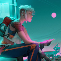 neon lights indicating it might be nighttime or in a low-light environment designed to look like the future.
