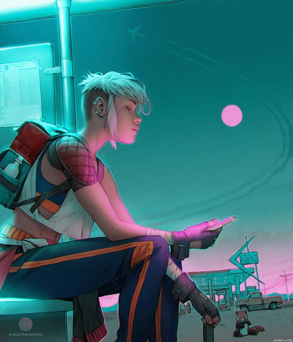 a female character, who appears to be a cyborg or android, sitting on a bench. She has