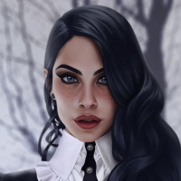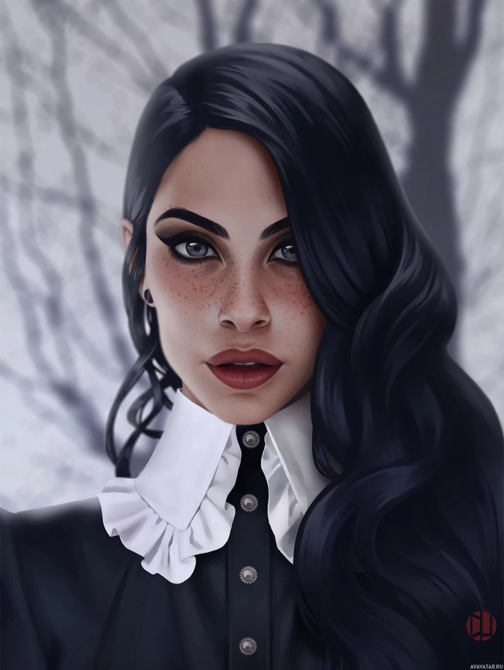 expressive eyes, arched eyebrows, and what appears to be a subtle nose piercing. Her lips are slightly parted as if she's in mid-speech or