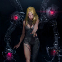 a science fiction setting, possibly related to cyberpunk or futuristic themes. Her pose and expression suggest confidence and power. In the background, there are robotic or mechanized elements that contribute to