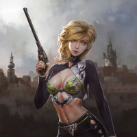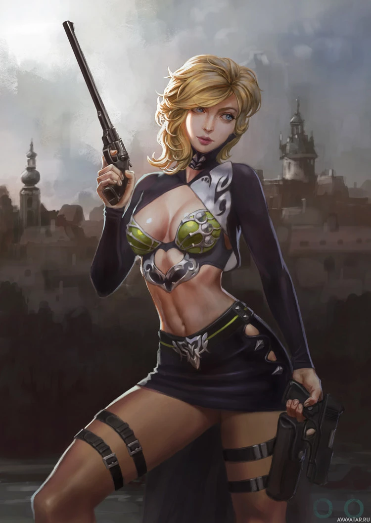blonde hair and is holding a pistol with one hand. Her attire includes what looks like armor elements, suggesting she might be from a fantasy or video game setting where characters often wear such outfits for