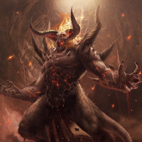 The image depicts a fantasy scene featuring a creature that resembles a demon. This character is shown with an imposing presence, standing amidst what appears to be hellfire or flames. The creature has large horns and a fierce expression, which adds to the menacing atmosphere of the artwork.