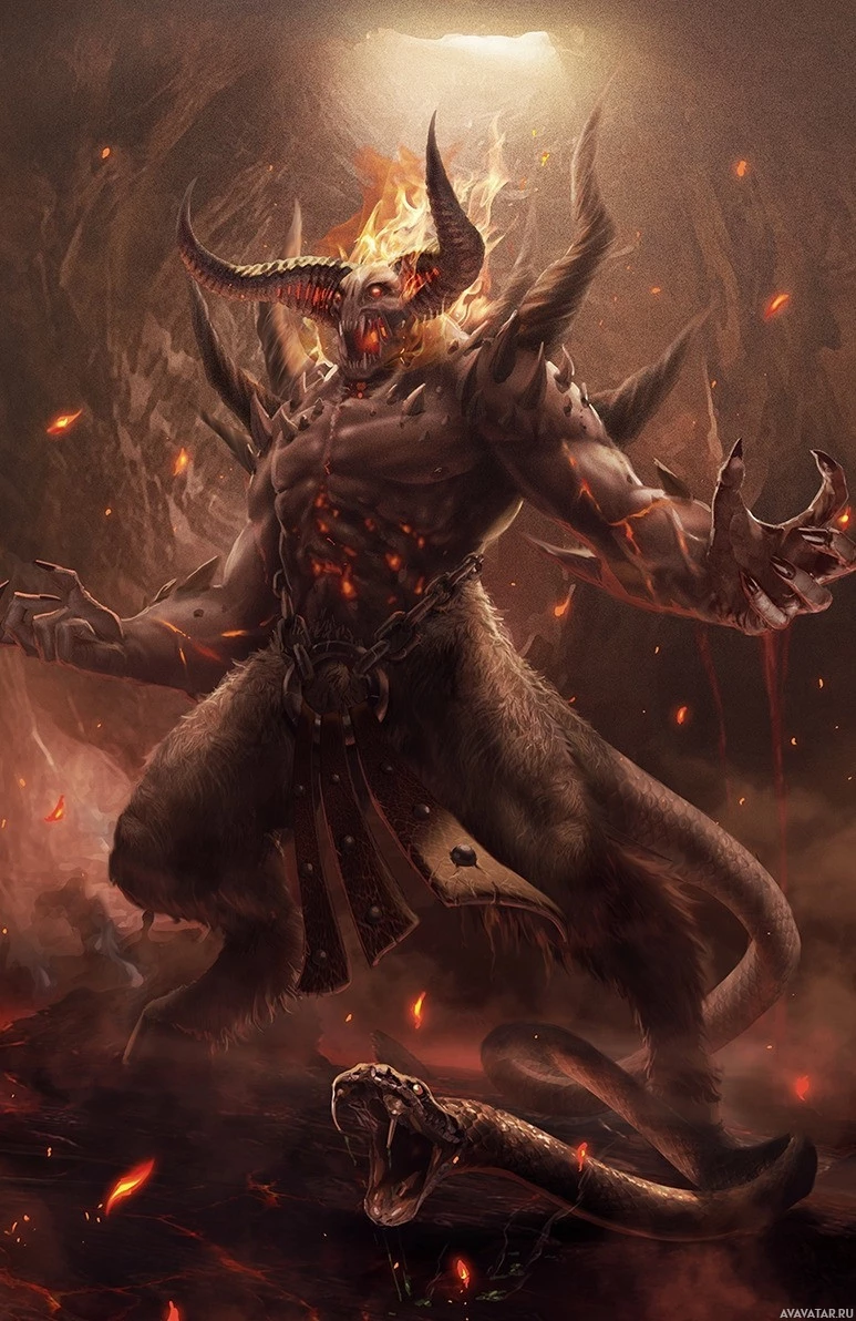 Картинка показывает фантастическую сцену с существом, напоминающим демона. Этот персонаж показан с внушительным присутствием, стоящим среди того, что кажется адским огнем или пламенем. У существа большие рога и яростное выражение лица, что добавляет угрожающей атмосфере произведения искусства.
