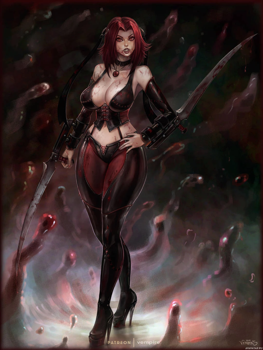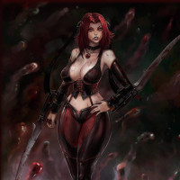 a dark background with various monster-like creatures around her, which adds to the fantastical and horror theme of the image.