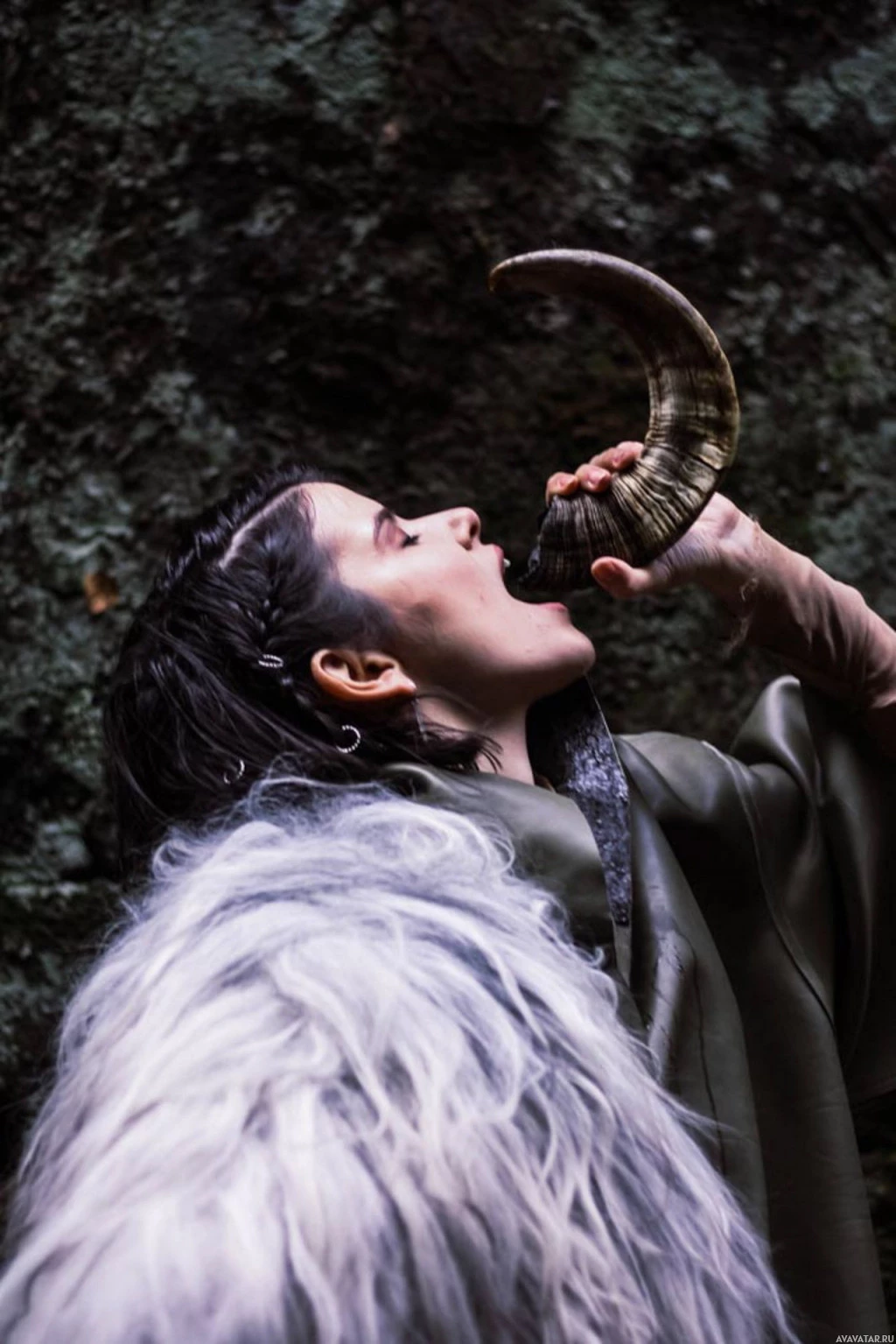 brunette hair. She is wearing what looks like a costume or outfit that could suggest a historical or mythological theme. The costume includes fur elements and she has accessories such as what seems to be a helmet or headpiece with horns, possibly indicating a role related to