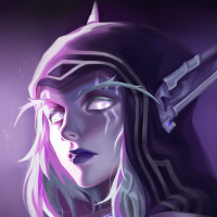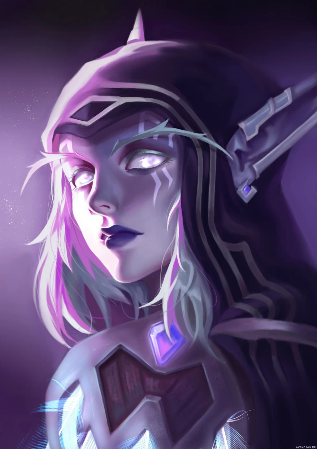 The image shows a fantasy-themed illustration of a character that appears to be from the "World of Warcraft" universe. This character is depicted with drow features, as evidenced by