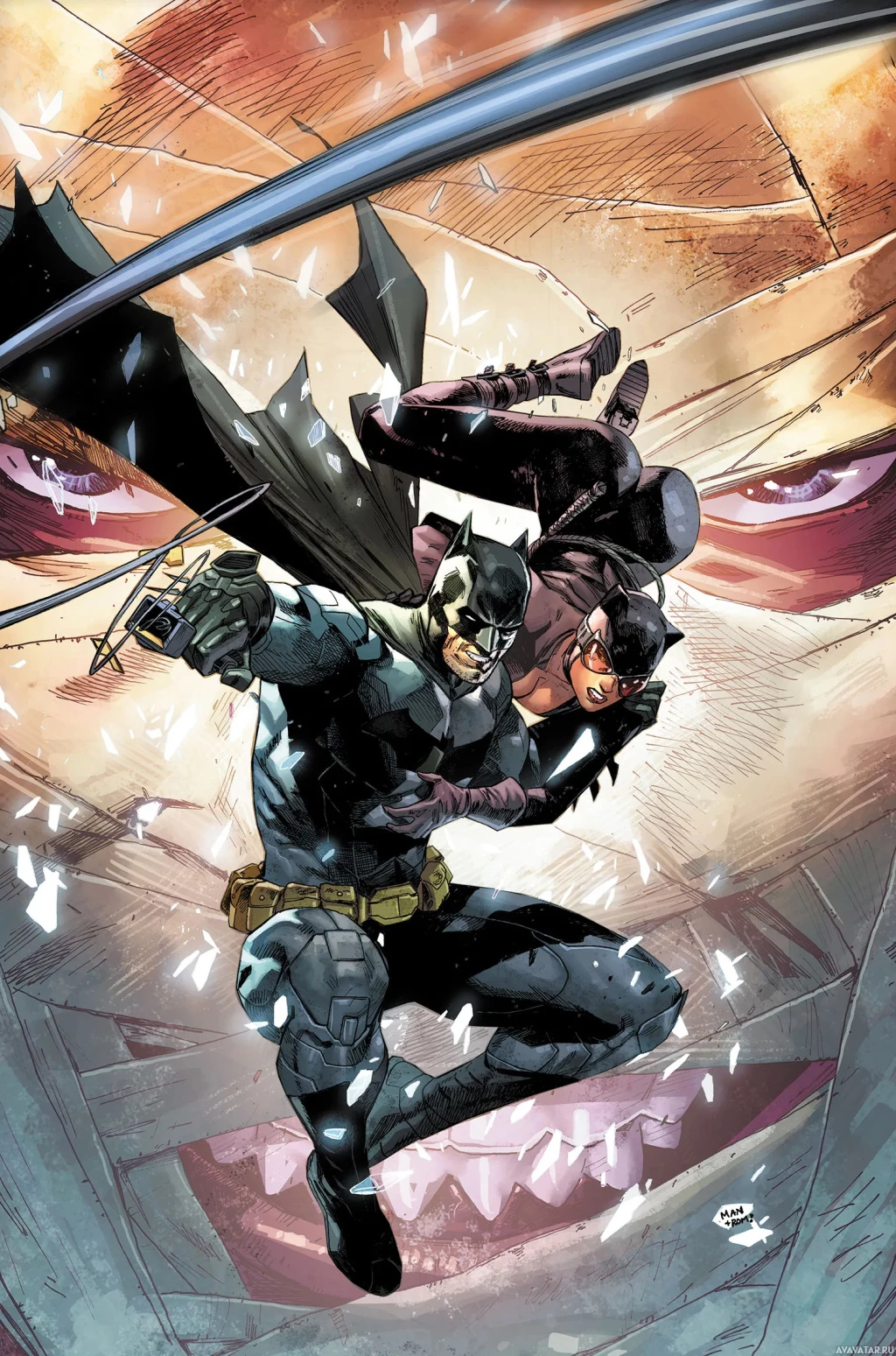 recognizable costume and feline ears. She appears to be grappling with Batman, perhaps depicting an action-packed encounter between them. The background suggests they are indoors, possibly on a rooftop or in