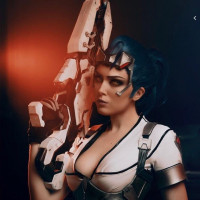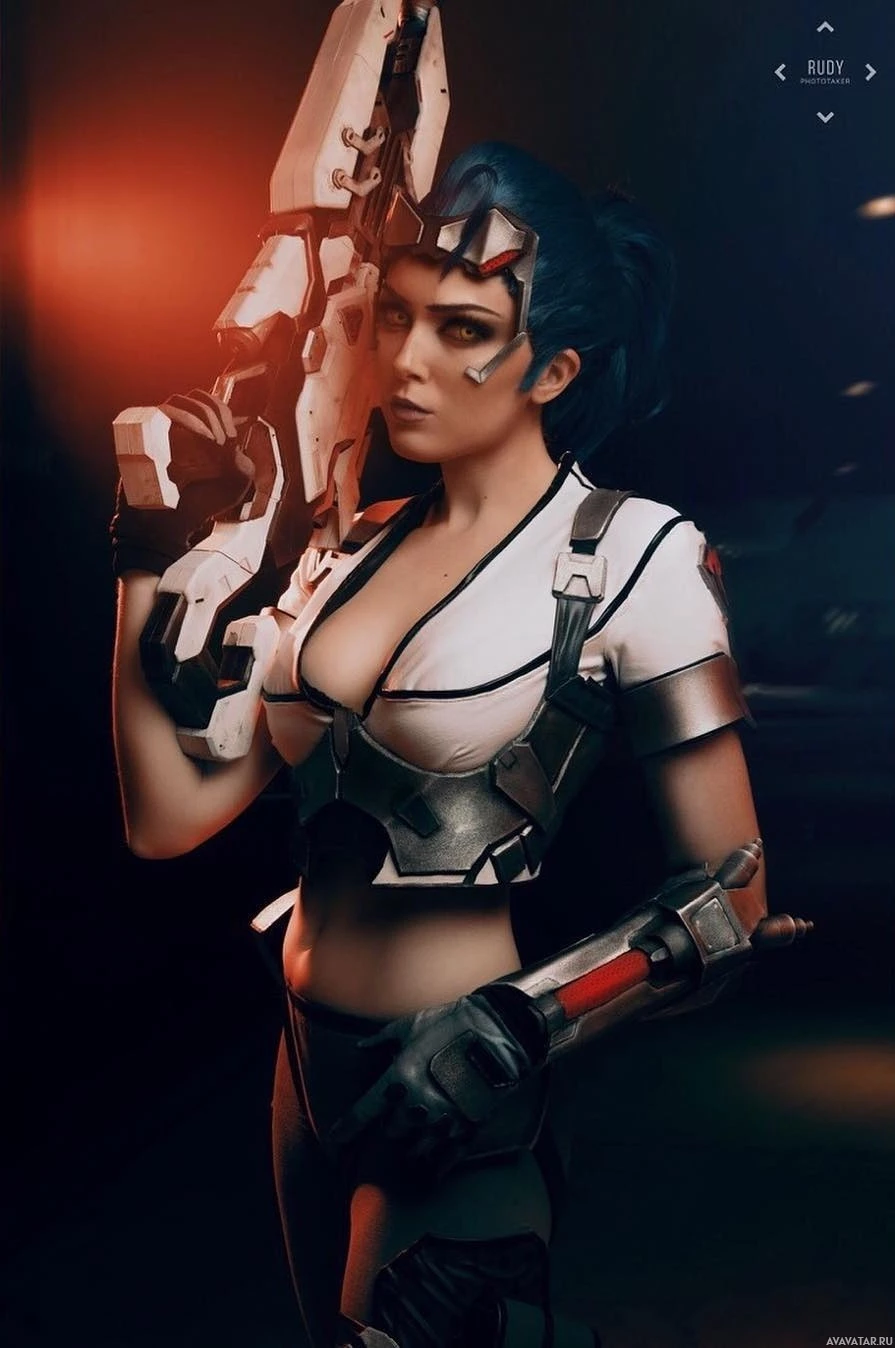 The image shows a character dressed in a cosplay outfit that resembles Widowmaker from