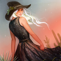 brimmed hat and there are cacti and desert plants around her, suggesting a Western or Southwestern setting. The art style is illustrative and vibrant, with a clear