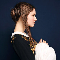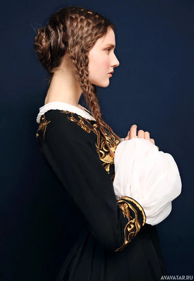 The image shows a young woman posing for the photograph. She has her hair styled in braids and is wearing what appears to be historical or period clothing, possibly inspired by traditional or vintage fashion. The background is a solid color, which helps draw attention to her attire and expression.