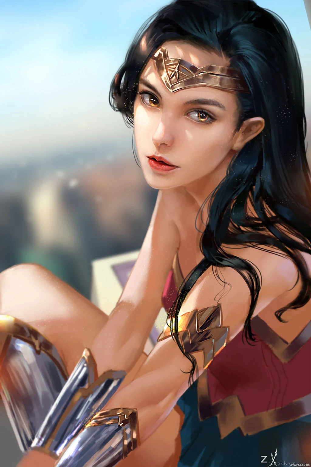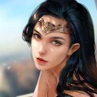 The image features a digital art representation of Wonder Woman,