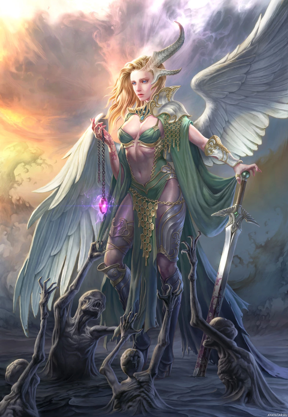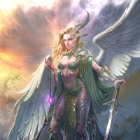 a fantasy scene featuring a character with angelic wings and a demonic appearance. This character is holding a sword, suggesting she might be a warrior or