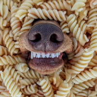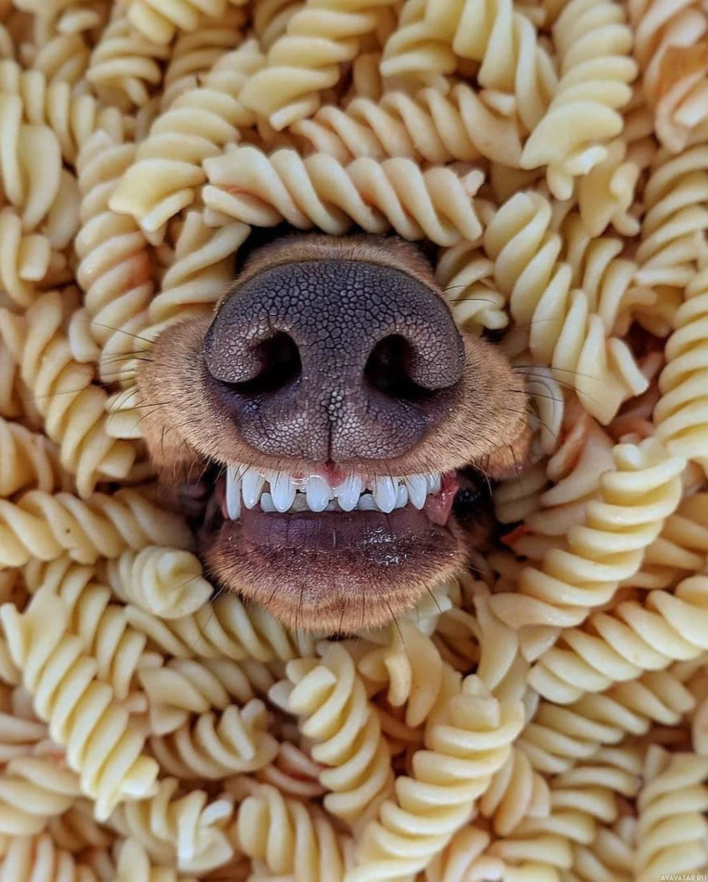 На картинке изображена голова собаки, высовывающаяся из центра кучи макаронных изделий, в частности спагетти. Собака, кажется, наслаждается едой. Это забавная и игривая сцена, которая может быть связана с весельем или юмором.